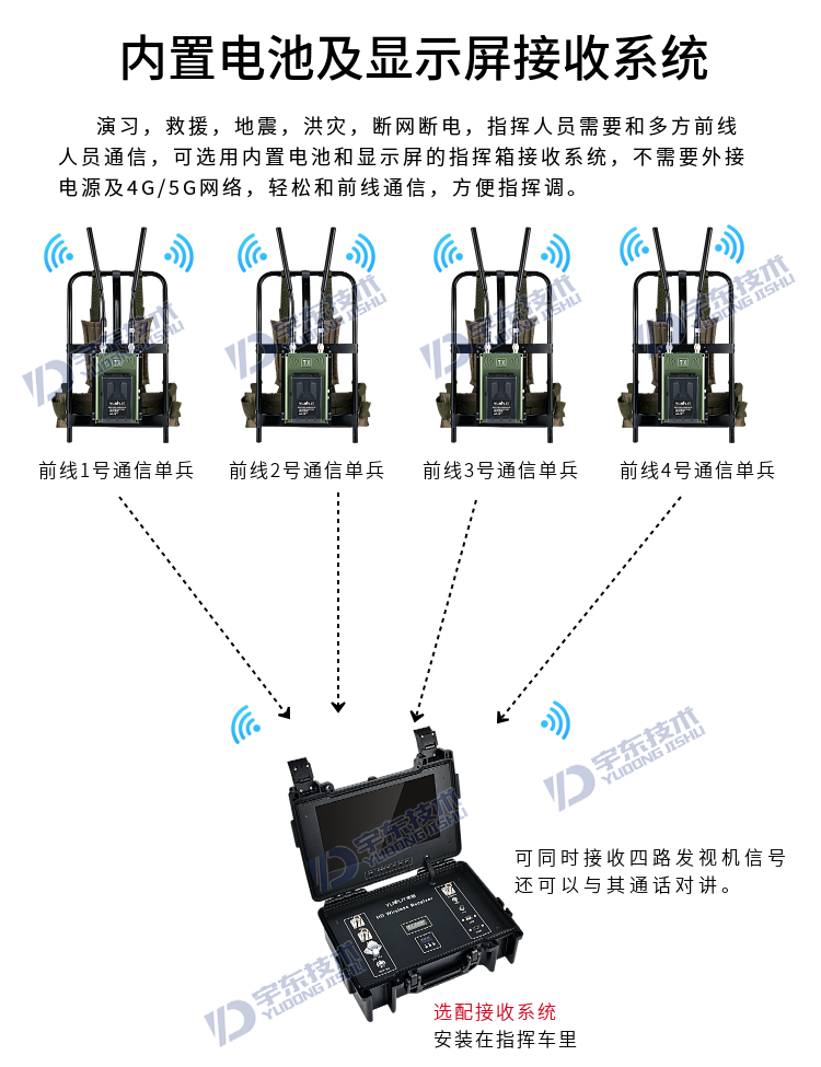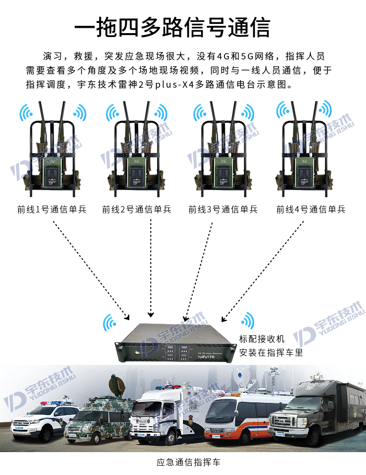 宇東技術(shù)雷神2號plus-X4一拖四背負(fù)式高清無線圖傳電臺,是應(yīng)對突發(fā)事故,斷網(wǎng)斷電,如地震、洪災(zāi)、反恐、應(yīng)急救援、部隊(duì)演習(xí)等使用通信,本設(shè)備由4路背負(fù)式單兵發(fā)射機(jī)電臺和1臺四路接收于一體的接收電臺地面指揮箱組成,指揮箱自帶四路接收模組和顯示器及功能按鍵,可同時(shí)接收四路發(fā)射機(jī)的視頻和對講信號數(shù)據(jù),指揮箱自帶揚(yáng)聲器,可接收DV無線發(fā)送現(xiàn)場的聲音數(shù)據(jù)。支持?jǐn)U展HDMI外接顯示大屏及插USB錄像保存功能,真正義意上做到及時(shí)取證,錄像保存,移動(dòng)通信,統(tǒng)計(jì)指揮調(diào)度等。