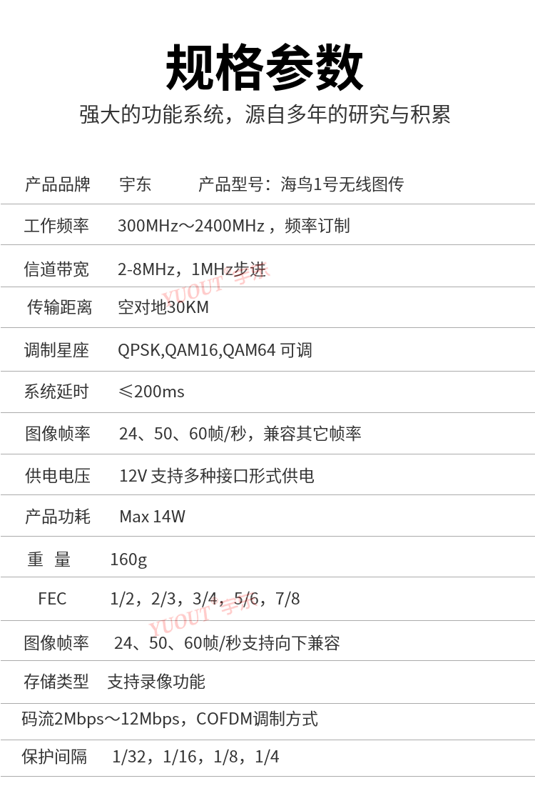 宇東海鳥1號無線圖傳高清微型無線視頻傳輸系統,采用Coded Orthogonal Frequency Division Multiplexing:編碼正交頻分復用調制技術,具有傳輸頻帶窄、很強的抗多徑干擾能力和抗多徑衰落能力,能夠實現非視距(NLOS),高速運動情況下實時傳輸高質量圖像。
